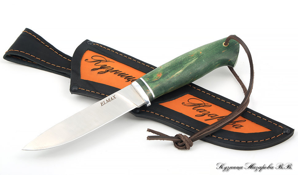 Нож Путник сталь ELMAX - сатин рукоять карельская береза (зеленая). Изделие сертифицировано по ГОСТ 51644-2000 «Ножи разделочные и шкуросъемные».