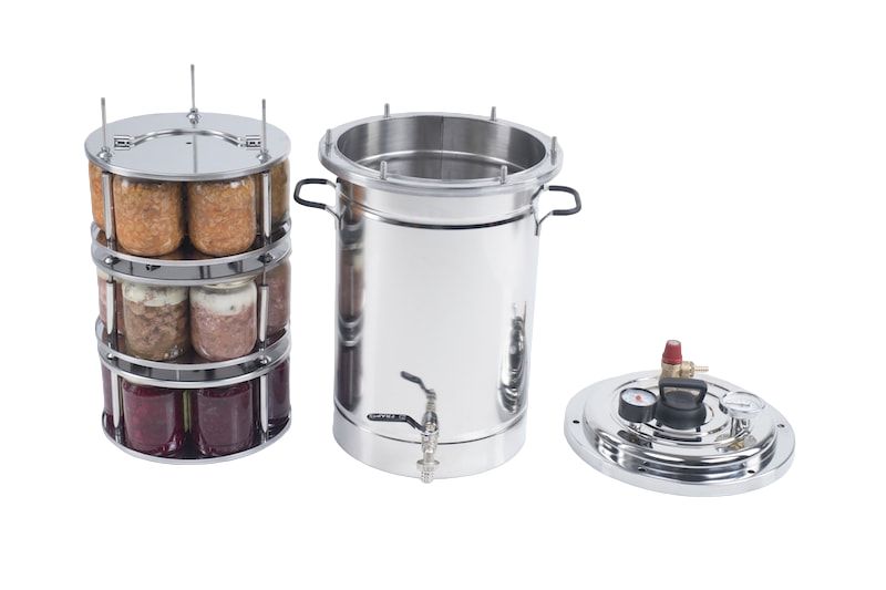 Автоклав оснащен автоматическим клапаном сброса избыточного давления на 1,5 атм. Он самостоятельно будет поддерживать в автоклаве необходимое давление и не даст перегреть продукты.