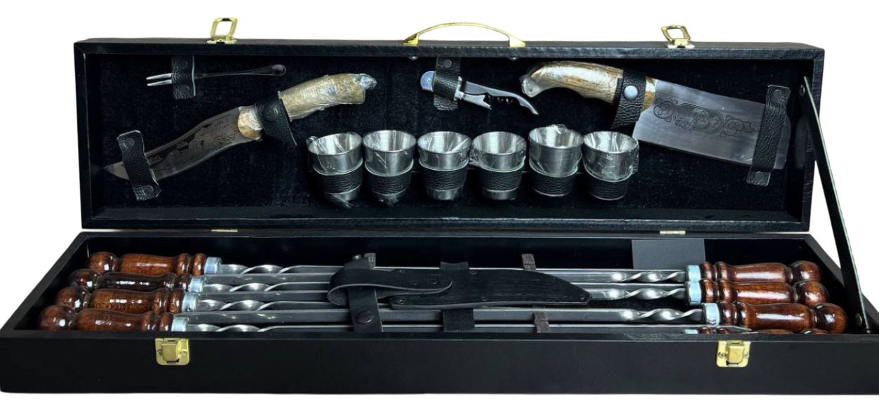 Все это упаковано в прочный кейс обтянутый эко-кожей, отделка внутри-красная бархатная ткань.