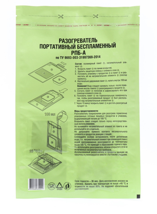 Принцип работы: при контакте с водой нагревающий элемент выделяет тепло, испаряя попавшую внутрь воду, а образующийся пар нагревает еду, помещенную внутрь упаковки.